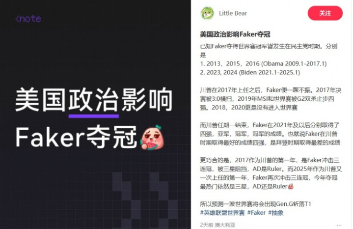 荒诞又合理网友帖: 美国政治影响Faker夺冠 今年GEN将斩落T1